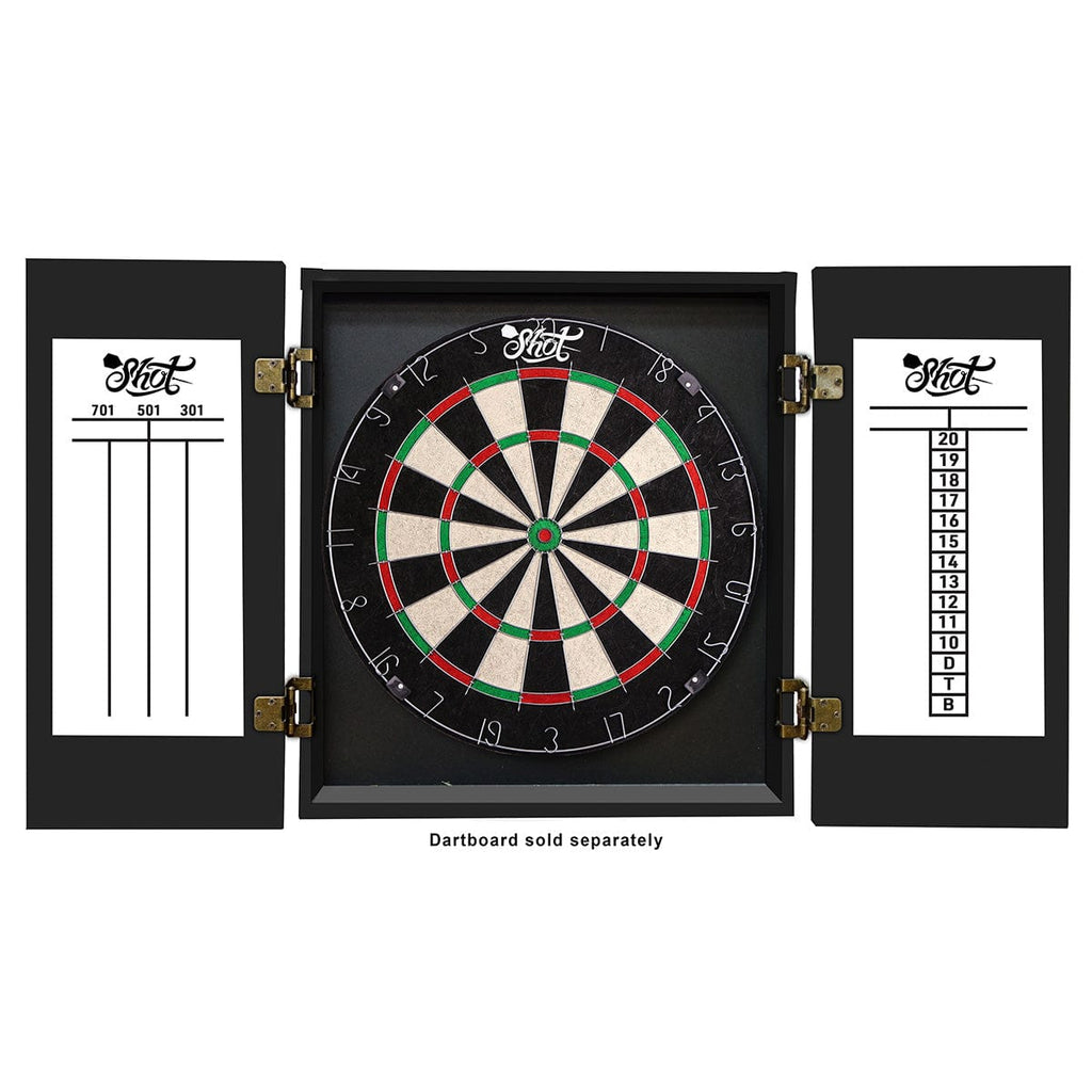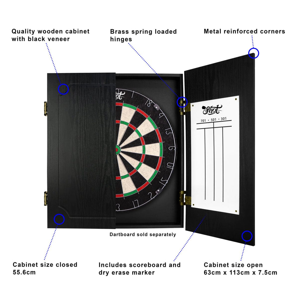 The Quantum Dartboard cabinet is an oversized cabinet compatible with all dartboards, including the Shot Outlaw and Bandit. Now with included Shot Darts specialised hanging U bracket for easy dartboard rotation. Made from high-quality wood with black veneer, tough brass spring-loaded hinges, and metal reinforced corners. Includes dry-erase scoreboards and marker pen.