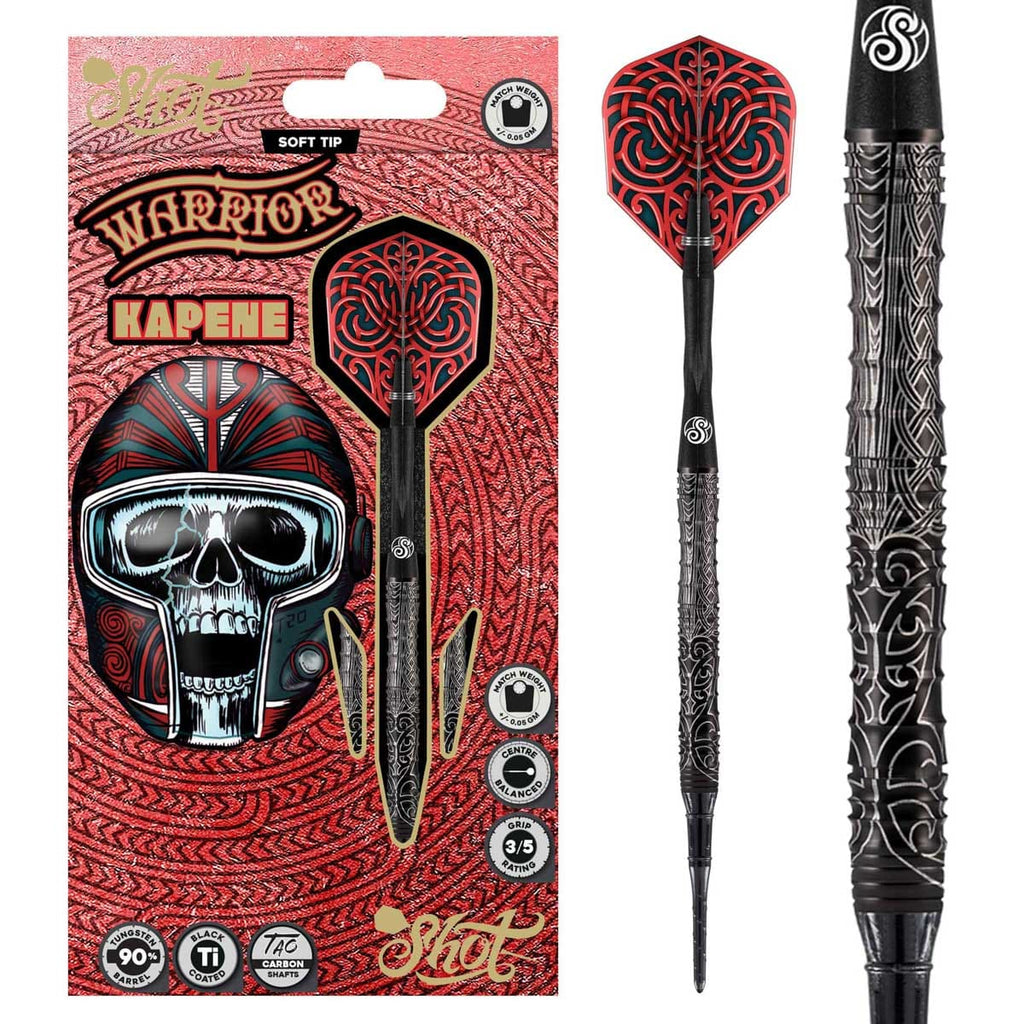 Forged through fierce competition and battle-hardened technique, honed since 1970, Warrior Kapene steps forward to steer our global tribe into the next 50 years. With a straight shape and centre weight, Kapene boasts a generous shark grip along the barrel. Rear and front scallops give this 90% Tungsten dart set two positive throw areas – for a strong push and a sure reference point. Armoured in superfine Titanium with a laser-etched Ta Moko (tribal tattoo) sleeve that’s echoed in its flight.