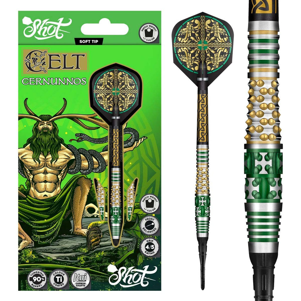 Wield your spear and flaunt your antlers. The Cernunnos dart set captures the wisdom of this forest guardian and mystical Celtic god of beasts and wild, mist-shrouded landscapes. With its intricate texture, its Celtic Cross, and Briar grips carved like the bark of mighty oaks and coated in green and gold, this front-weighted 90% tungsten barrel will help you see the wood for the trees.