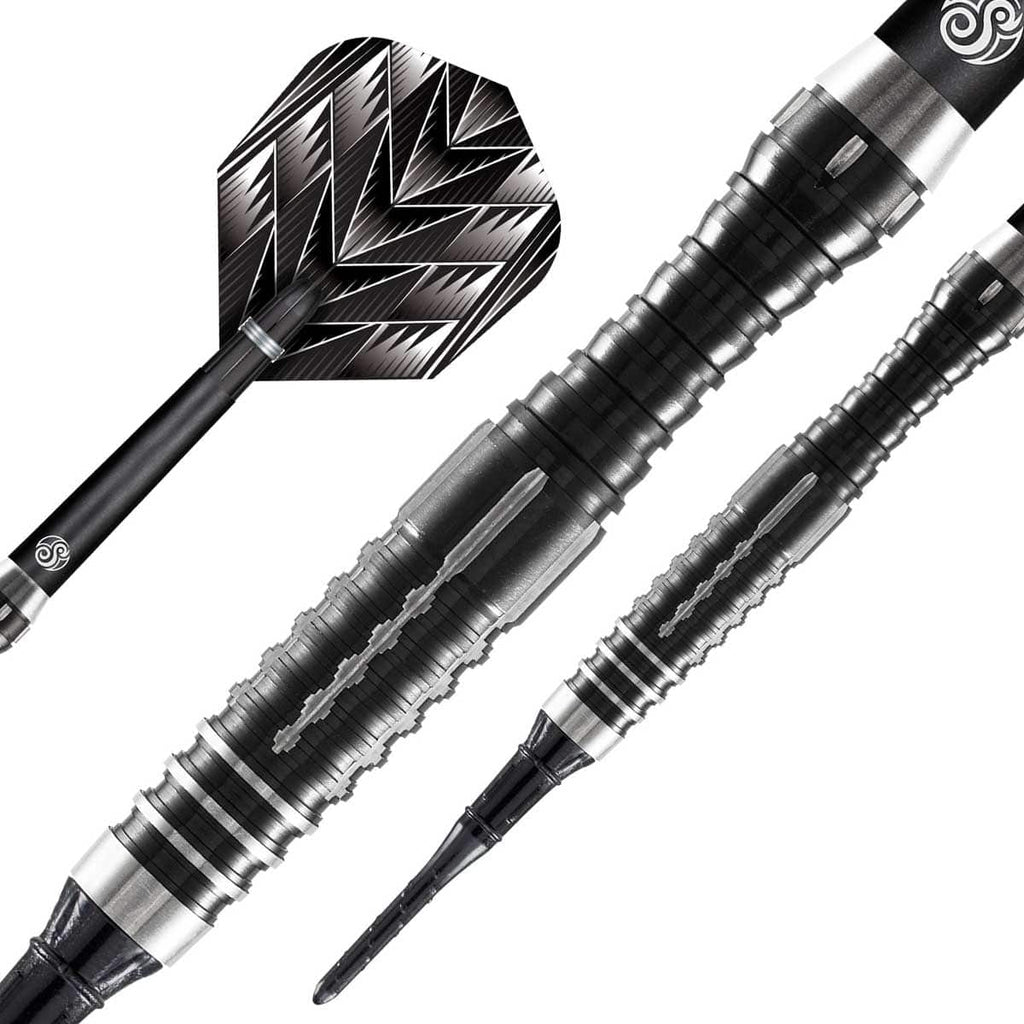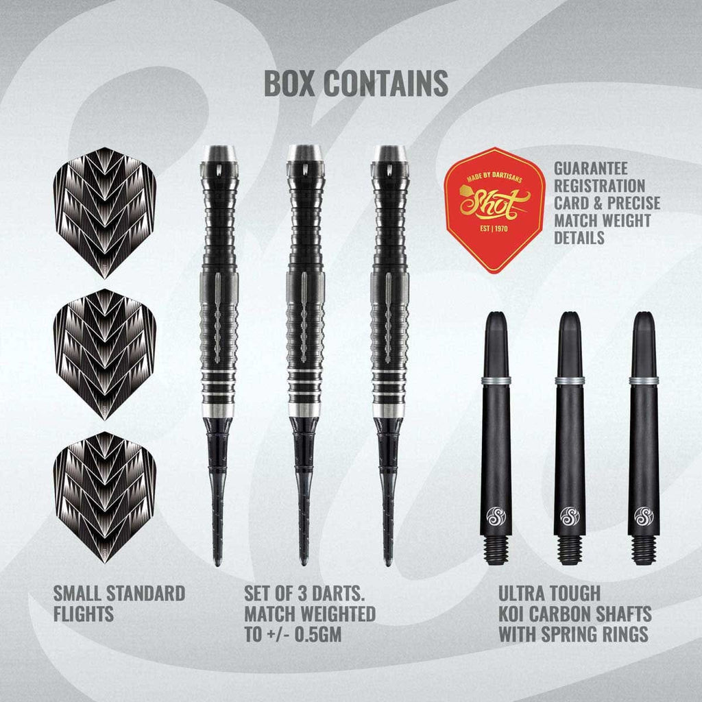 Barrel Design: This dart Is designed with a tapered nose with both the Shot Darts signature pyramid grip and an axial grip to enhance feel and grip during play. The dart then scallops up to a flat section with a featured axial grip that enhances the grip and provides no slip during play. This version features the same trusty rear scallop from the Tribal Weapon 2, with wider more spaced out shark/ring grip that provides more grip and a better push release when throwing. The barrel finishes with a small taper that rises to a high flat point in the rear of the dart which serves as a lead-in point for the Scallop. Ideal for all throwers but mainly suited towards front thrower.